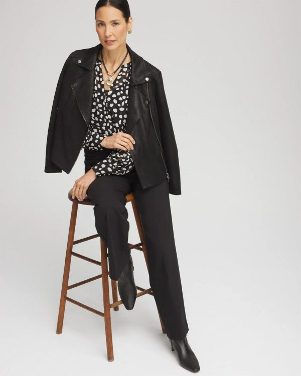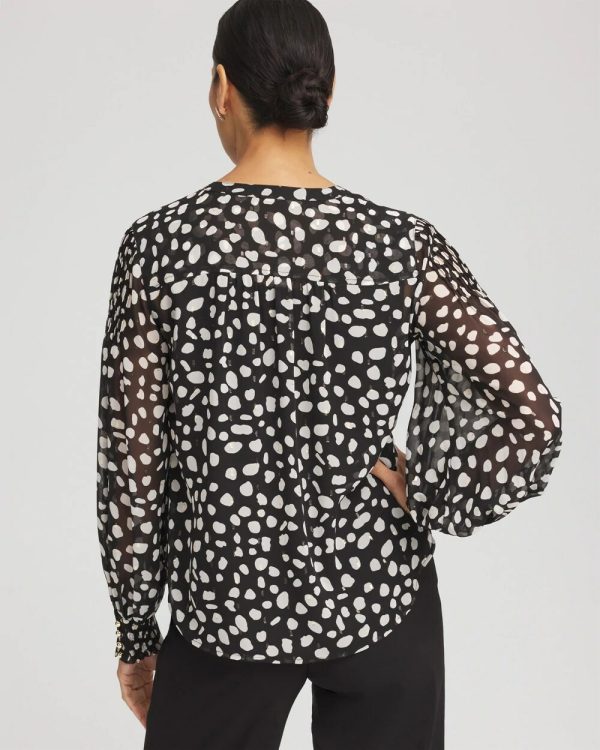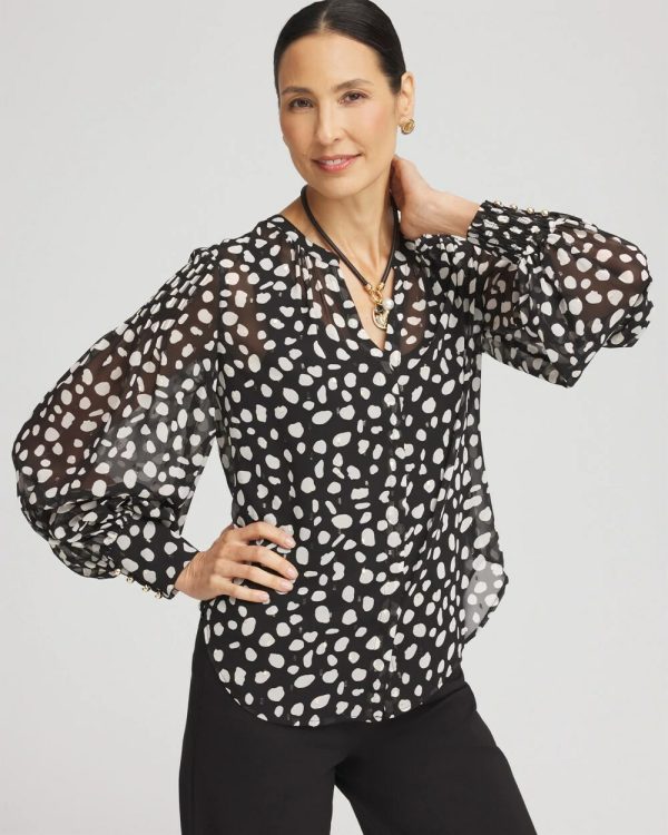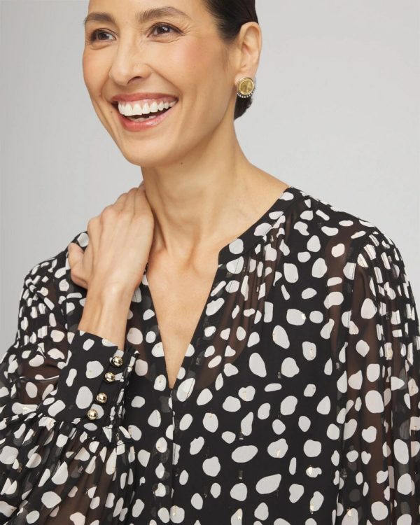 The Metallic Clip Dot Pintuck Sleeve Blouse is simply gorgeous. This chiffon blouse has four gold buttons at the cuffs, and pintucks at the shoulder and back to create a flattering silhouette. This blouse is transparent and will need a camisole or one of our Microfiber Tank tops.
