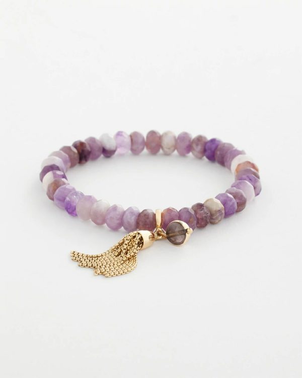 High-quality, meticulously selected faceted beads made from genuine amethyst stone. Showcasing an eye-catching brass tassel charm. These beads are cut from genuine amethyst stone, each one-of-a-kind bracelet will vary slightly.