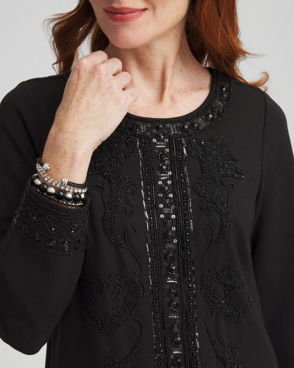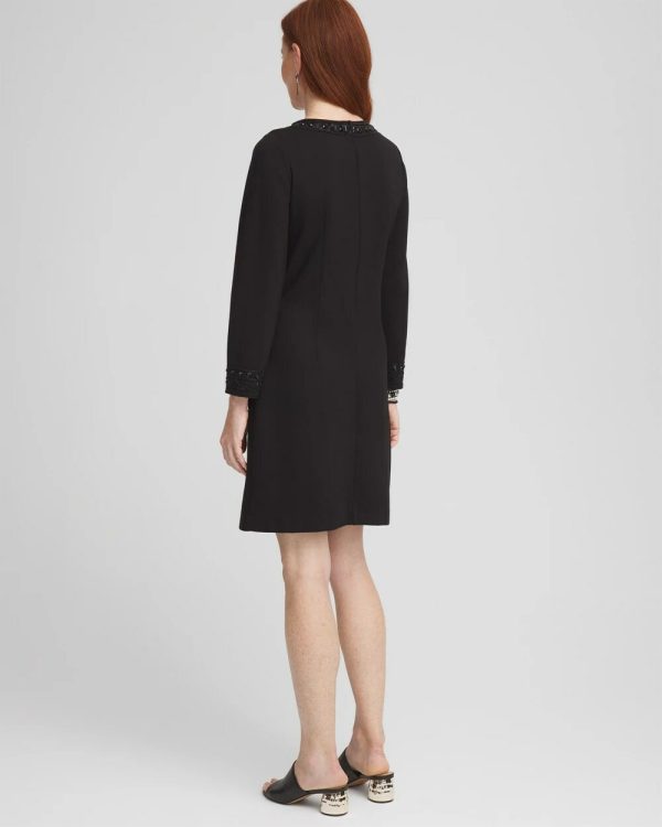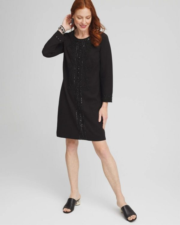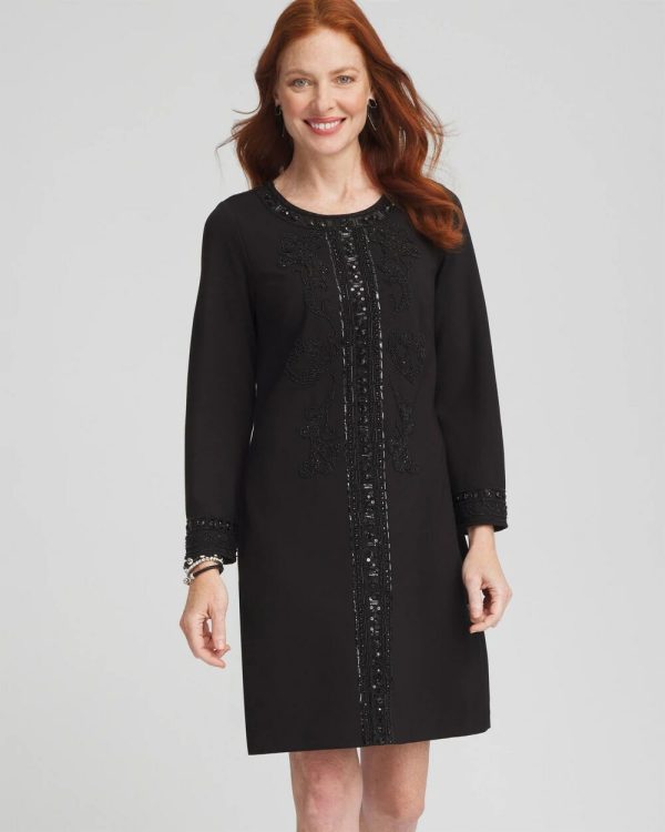 The classic LBD has been reimagined into a Embellished Ponte Sheath Dress. We opted to use a combination of crystals and beads to embellish the neckline, front and cuffs in a floral motif. Perfect for parties and fancy dinners out. Wear with heels or knee-high boots.