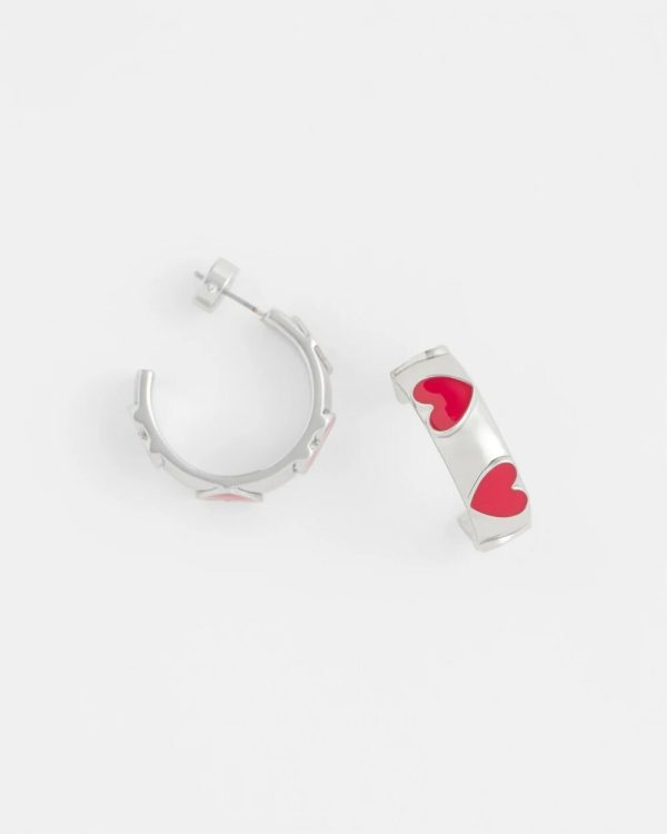 - Red heart hoop earrings with a post back.