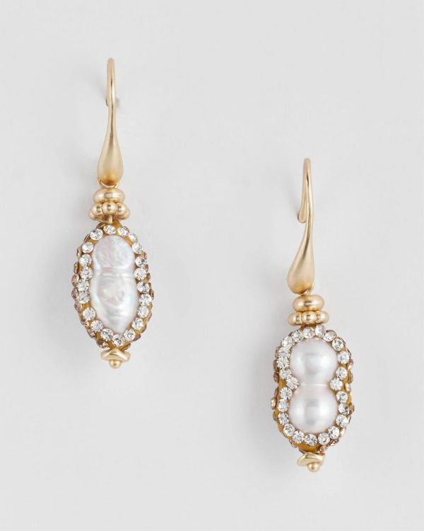 A new pair of freshwater pearl earrings, perfect for the endless serenity that is the summer season. Gorgeous gold-toned, showcasing a special technique that recreates a diamond crusted encasement effect. Two pearls merged together for each ear measuring approximately one inch. Natural pearls, will vary. Mix with like pieces and match with its matching bracelet.