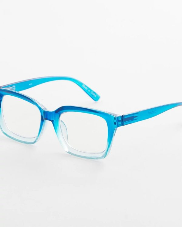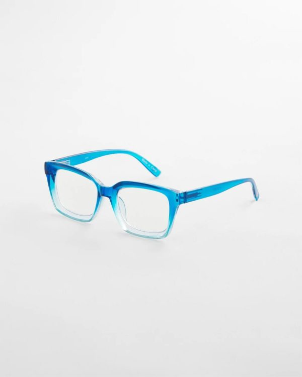 The new Blue Ombre Square Readers add a playful style to your studious look. Accented with our interlocking CC logo, wear these readers as your everyday pair to elevate your outfit. Complimentary canvas case included. Blue light filtering specs filter up to 40% of blue light emitted from digital devices, artificial fluorescent and LED light exposure. Flex hinges for long wearing comfort fits a variety of head sizes.