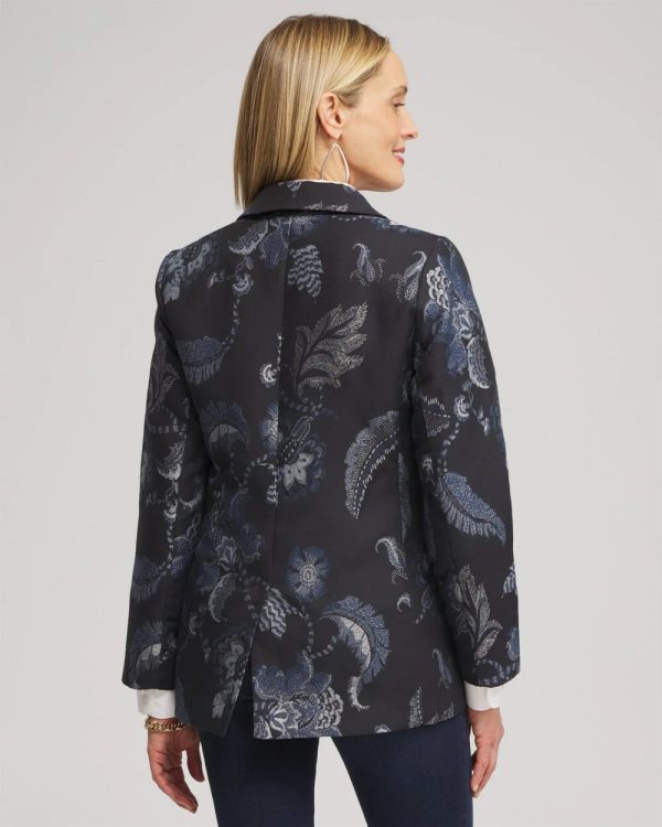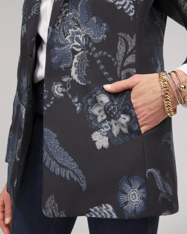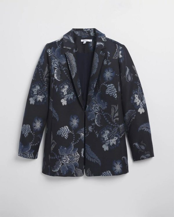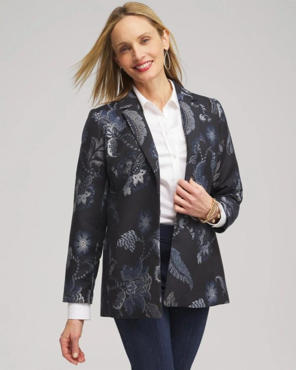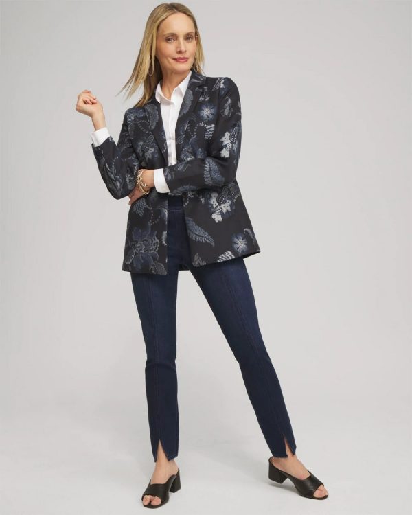 The Floral Jacquard Blazer is perfect for work or play. The jacquard print is exclusive to Chico’s, and the classic navy base makes it perfect for pairing with denim. Wear this topper for a polished casual look that has a feminine touch.