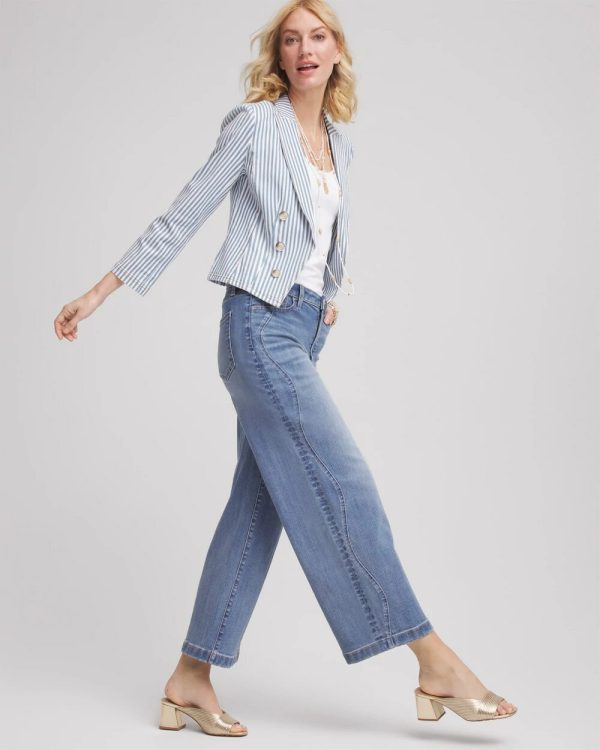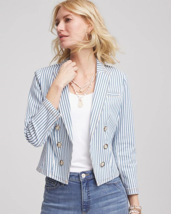Showcasing a series of special design techniques, this new denim jacket silhouette recreates a buttoned-down, double-breasted blazer effect. Open front, for-style neutral buttons. Collared with gentle lapels and a soft-blue striped motif. Pairs beautifully with matching alabaster and jeans.