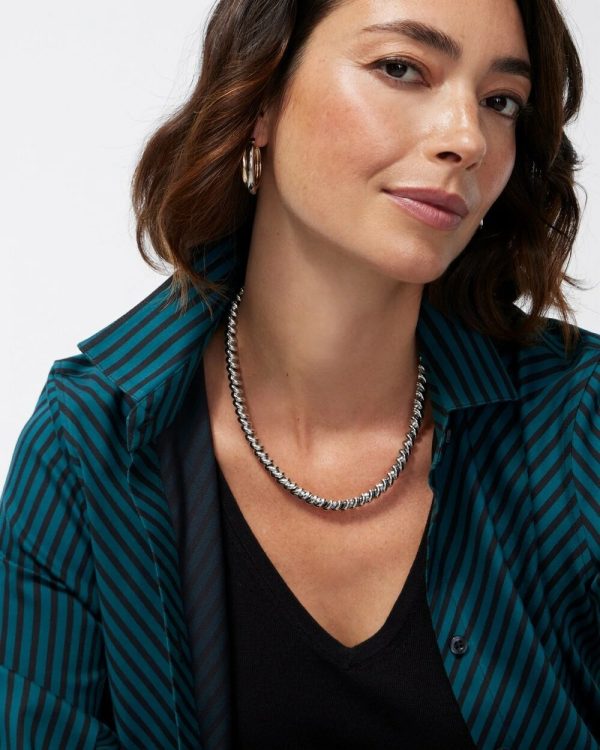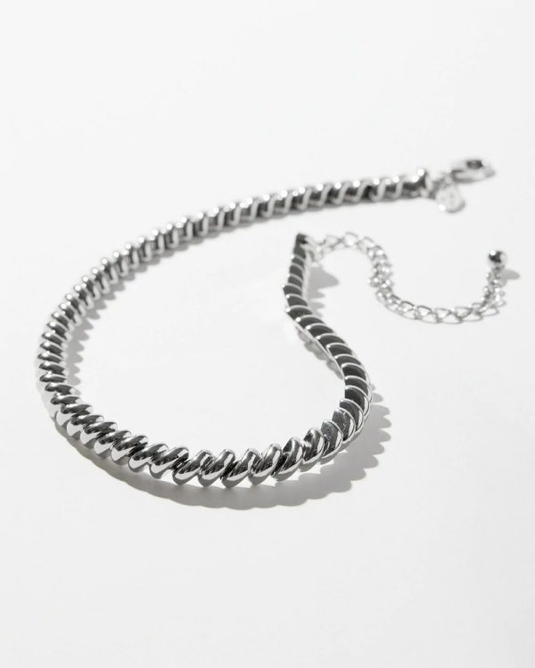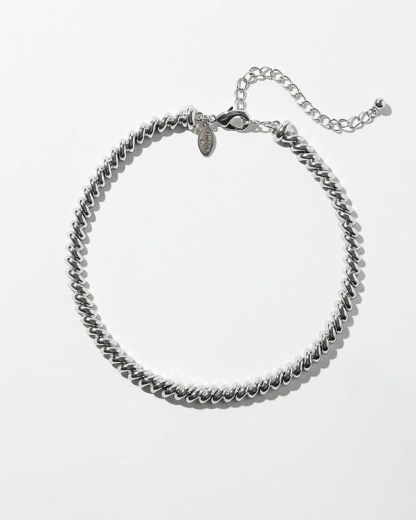 The Silver Tone Collar Necklace is simply elegant. This accessory features a sleek twist chain design style that adds charm to your look, day or night. Regardless of the season, this accessory elevates your special occasion looks.