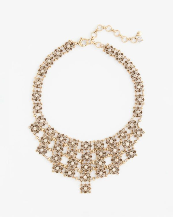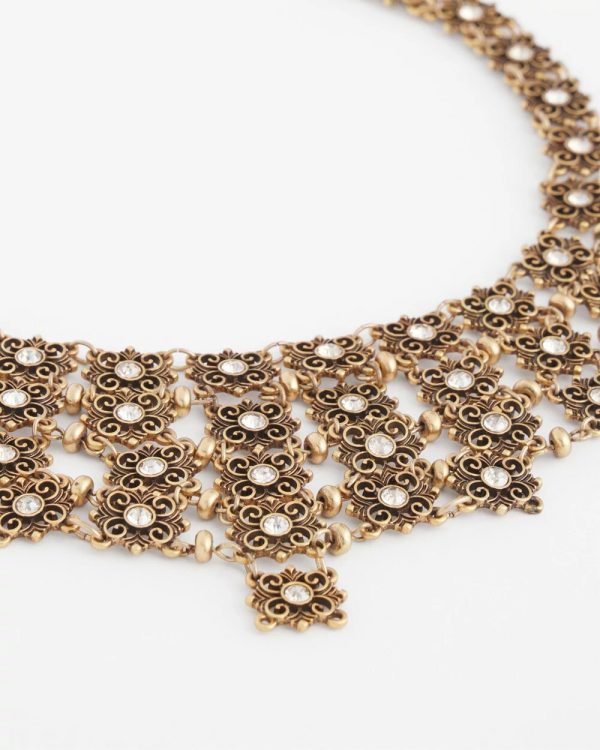 - Gold-tone filigree necklace with sparkling faux diamonds.