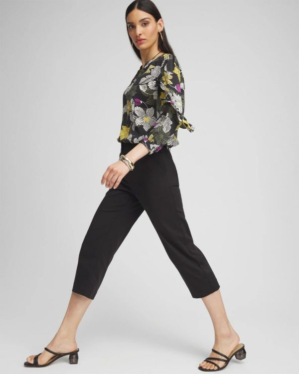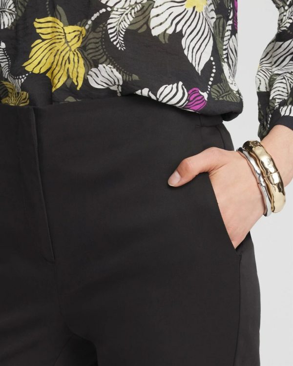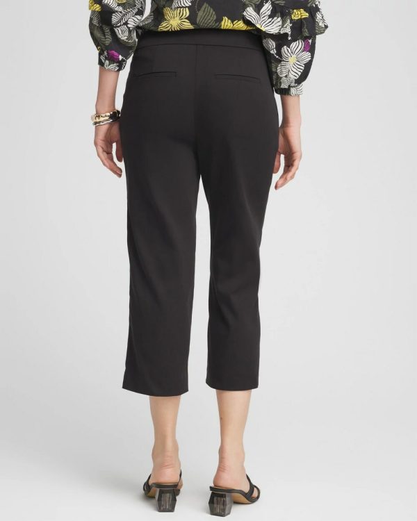 - Classic fit; fly front, elastic back waistband, front & back pockets, wide leg, capri length.