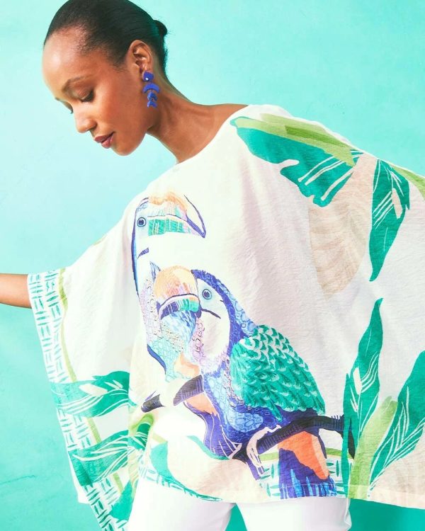 Don’t miss out on this, perfect for vacation, Island Motif Poncho. Showcasing an expertly designed set of tropical toucans in their natural habitat print on a solid alabaster backdrop. Featuring the season’s blue, purple, green, orange, and neutral hues with an exotic graphic border-trim print and boat neckline. Dress it down with jeggings on casual days, or dress is up with pants for more upscale affairs.