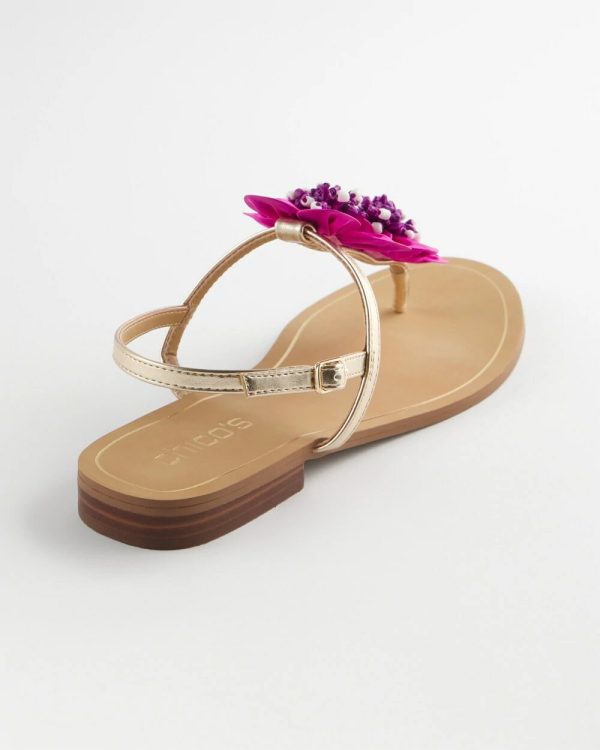 Inspired by the season’s Art Deco style, finish off your styles with the Sunset Flower Sandal. Handcrafted with high-quality and sleek-fashion sense. Made with bold pink nappa pu with fabric and hand beaded flowers. The thong styling comes with a back strap for stability and adjustable buckle.