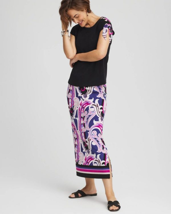 Chico’s new Travelers™ Paisley Midi Skirt is crafted from silky soft fabric printed with a pretty paisley print and colorblock border. Custom-colored to match our wrinkle-free Travelers™ collection. Classic-fit, Midi skirt.