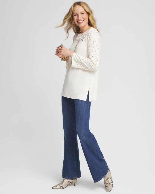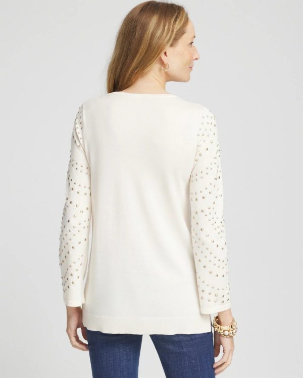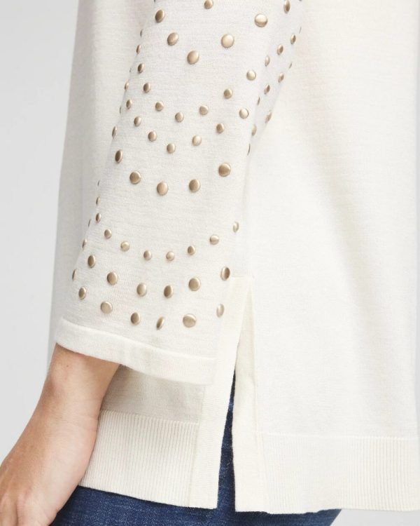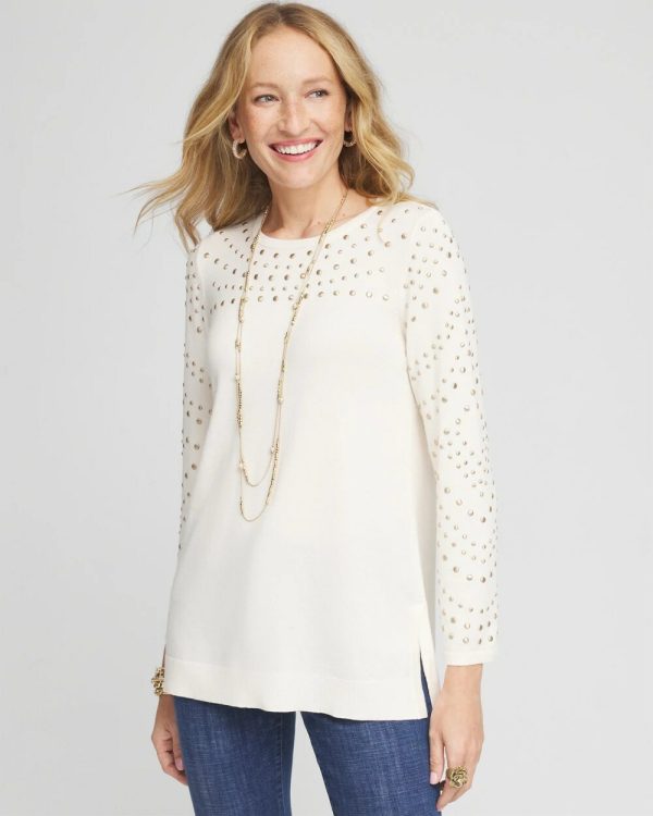 Be ready to celebrate in our Studded Crewneck Sweater Tunic. The heat set embellishments and slightly flared sleeves give this easy-to-wear pullover a lovely shimmer. Paired with pants or jeans, this sweater is sure to make a statement at seasonal events.
