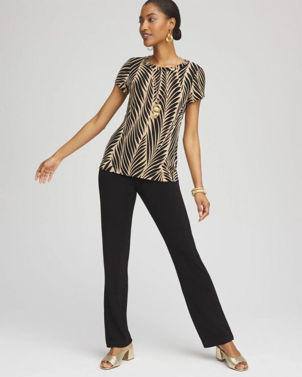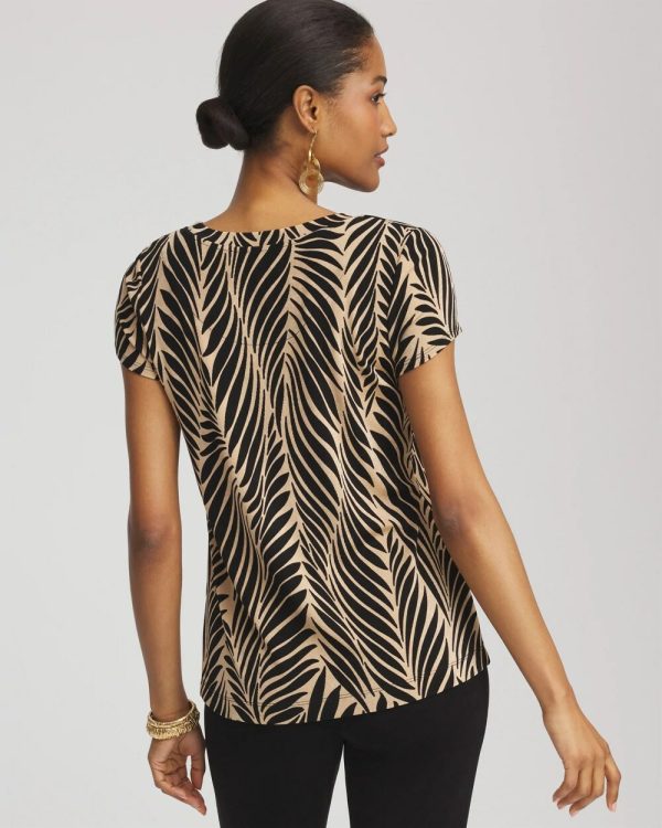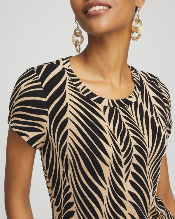 Captivate the room in this essential—made glamorous—by an intricately designed dimensional palm frond–inspired motif. Cut for a classic silhouette with a crew neckline and short cap sleeves from breathable travel-friendly, wrinkle-resistant, and sustainable Naia™ fabrication with flawless construction.
