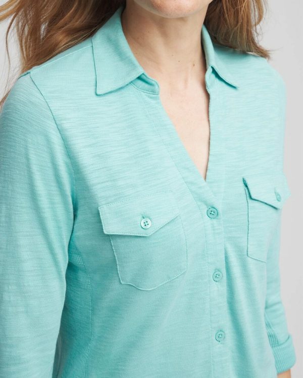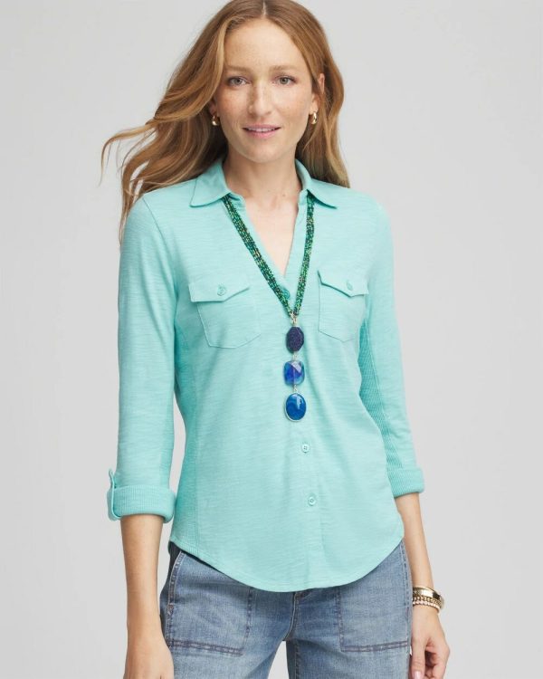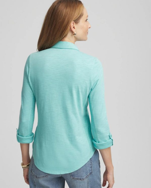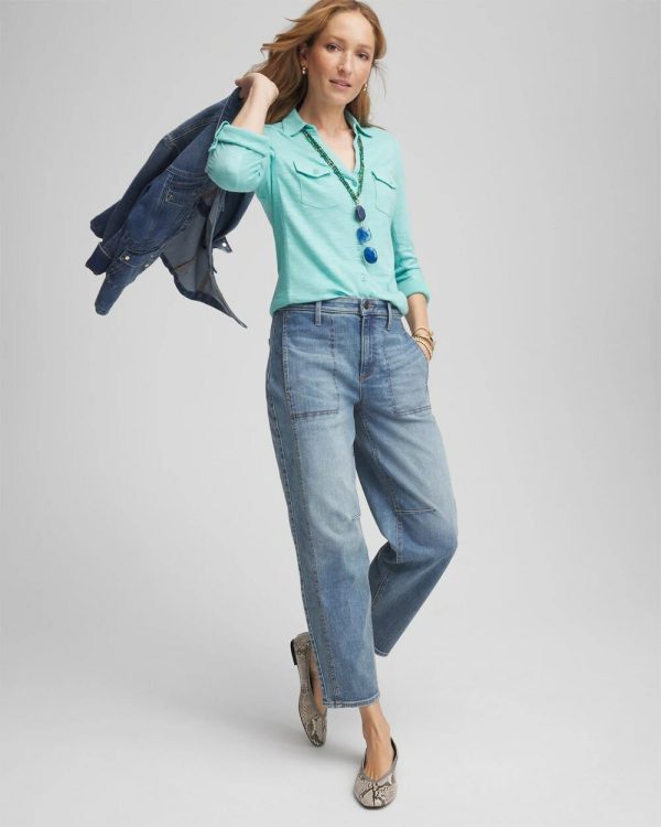 The Collared Henley Denim Top is a new sleek iteration of a Chico’s fashion mainstay. Featuring front pockets and adjustable rolled cuffs. Cut from customer-favorite soft slub fabric with a textured look and feel.
