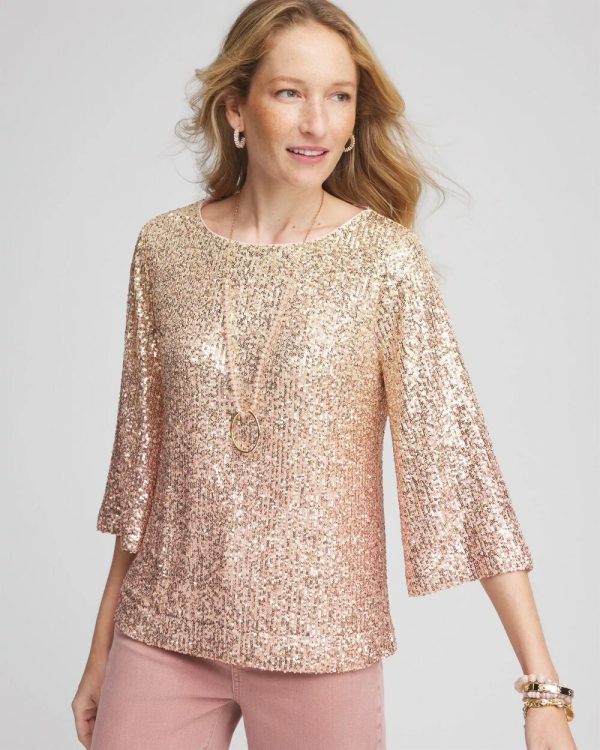 The Ombré Sequin Tee features flutter 3/4 sleeves and all over sequins in ombré rose gold that will turn heads this season. Pair with jeans or pants for glam outfit.