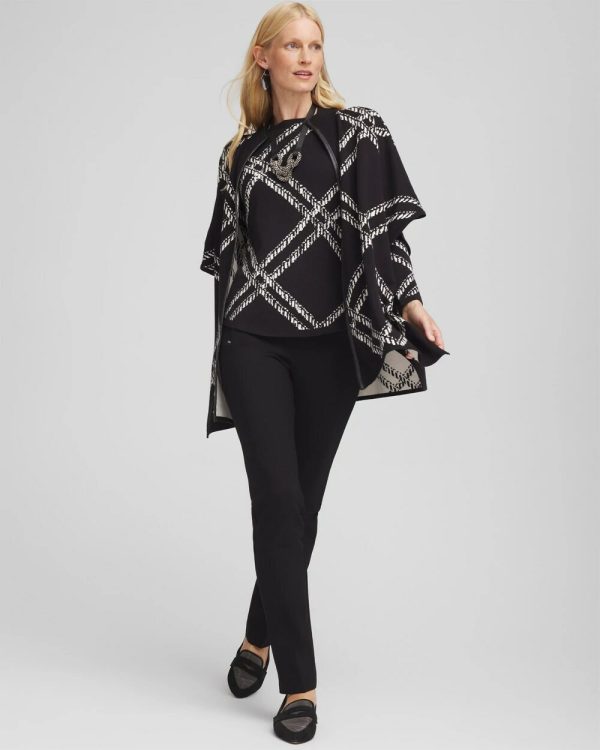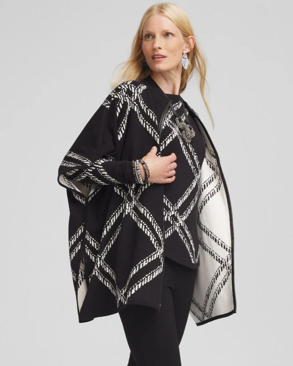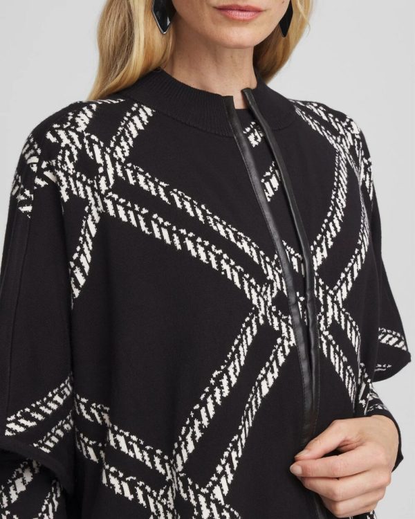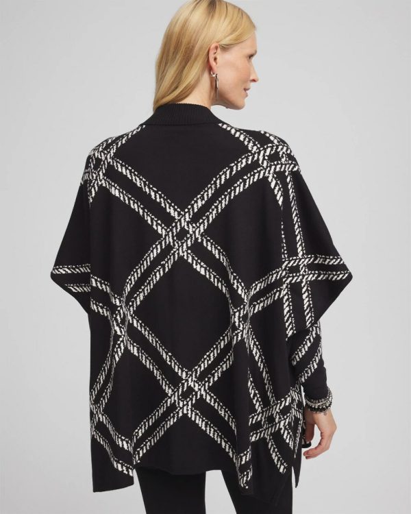 The Plaid Mockneck Ruana adds a bold look to any outfit. Featuring a jacquard plaid black and white pattern, this knit ruana is warm and statement making. Pair it with black pants or jeans for a compliment-worthy look.