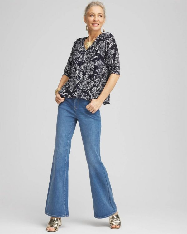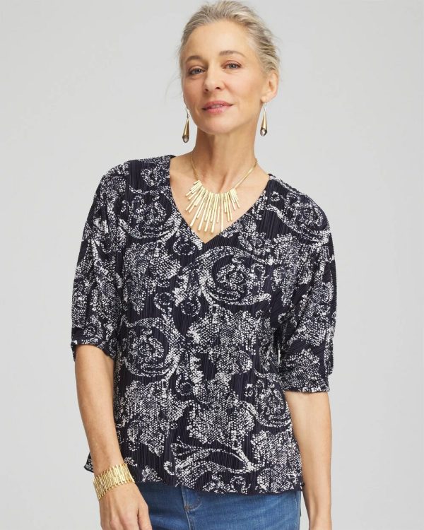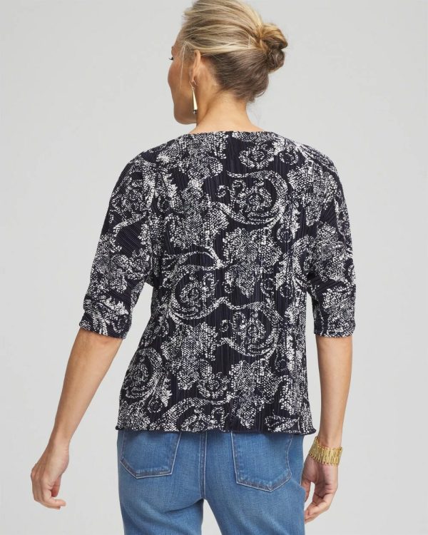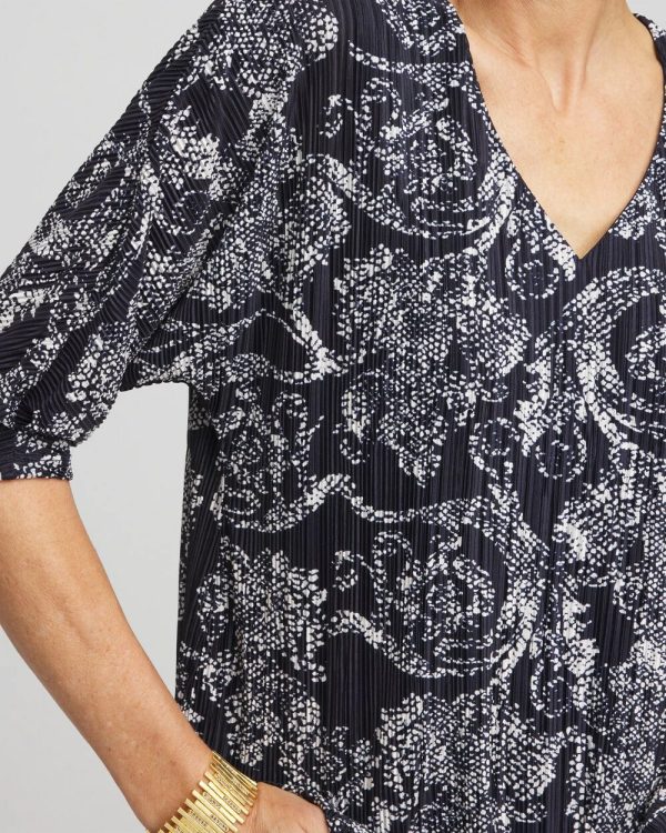 This Snakeskin Print Crinkle Elbow Sleeve Tee strikes a balance between feminine and fashionable with a soft, knit silhouette cut with dolman sleeves and a crinkle pleated pattern to layer beautifully with our Brigitte jeans or Juliet pants.