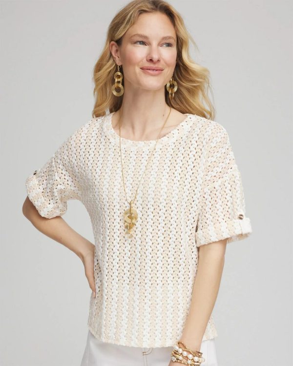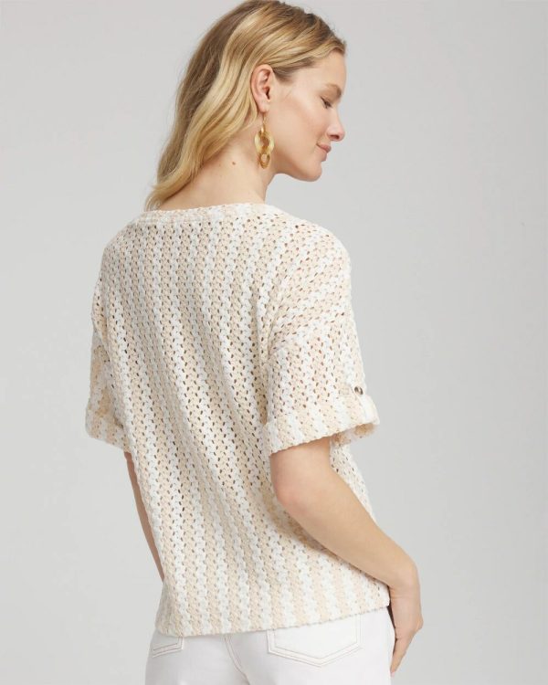 Showcasing a special technique that recreates a tonal, open-stitch crochet lace effect. Featuring roll-tab short sleeves with button closure and a crewneckline. Pair with Chico’s neutral outwear, accessories, and jewelry.